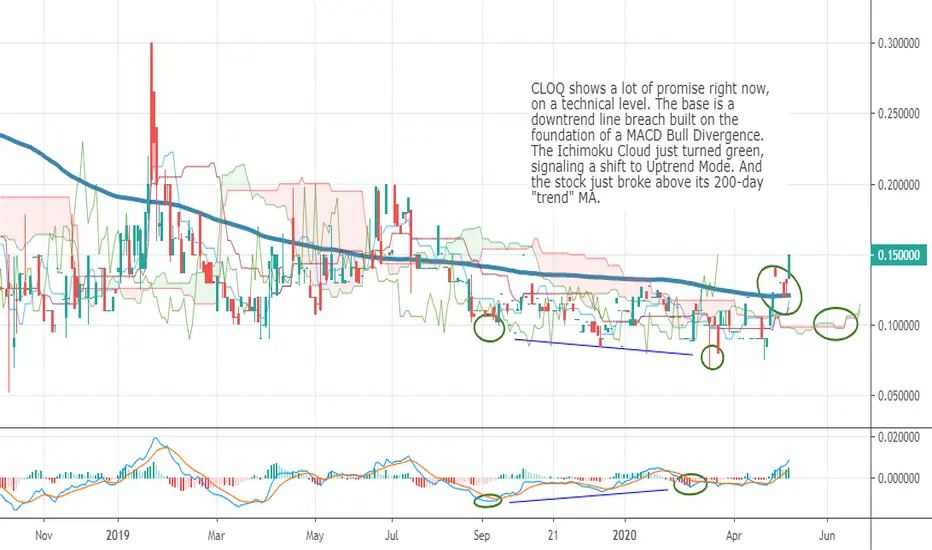 CLOQ shows a lot of promise right now, particularly on a technical level. The stock has formed a basing pattern built on the foundation of a MACD Bull Divergence.