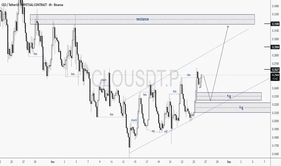 A dip into the nearest FVG (0.235–0.240 zone) or FVG (0.210–0.220) can be a high-probability long entry. After collecting liquidity, price is expected to expand upward toward 0.290 → 0.318 major resistance.