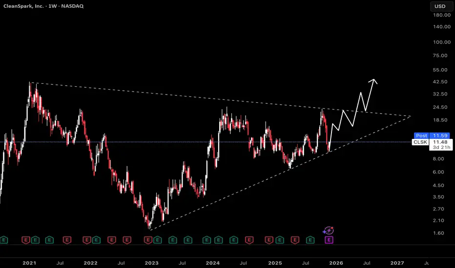 This weekly chart tracks CleanSpark, revealing an extended symmetrical triangle formation that has dictated price action since mid-2021. Symmetrical triangles often signal a period of compression in volatility, building up for a breakout as price coils between support and resistance trendlines.