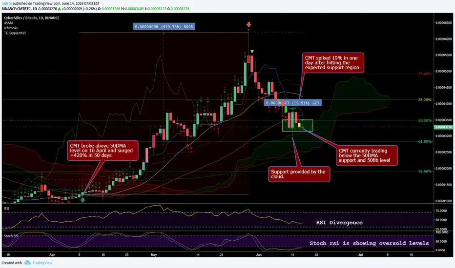 CMT spiked 19% in one day after hitting the expected support region, bouncing off the cloud region.