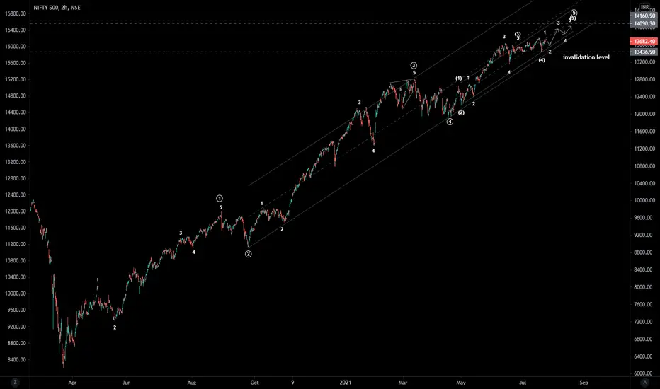 It is in 5th of 5th wave until price remains above 13436 and target would be above 14100 approx..