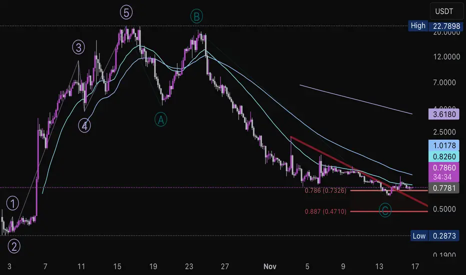 COAI recently broke above the descending trend line after hitting the 78.6 fibonacci retracement of the sharp move up in early October. The chart can be interpreted as 5 waves up and 3 down, potentially creating a long opportunity up to recent high and perhaps even larger if this is the start of a larger cycle.