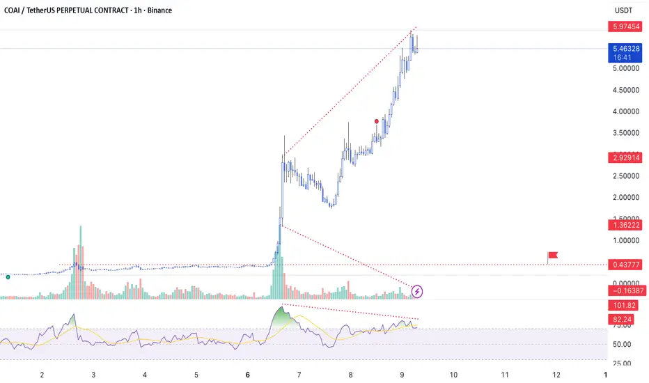 COAI is currently in the final euphoric phase of its uptrend, showing signs of bearish divergence and weakening volume, which suggests a high probability of an upcoming correction phase.