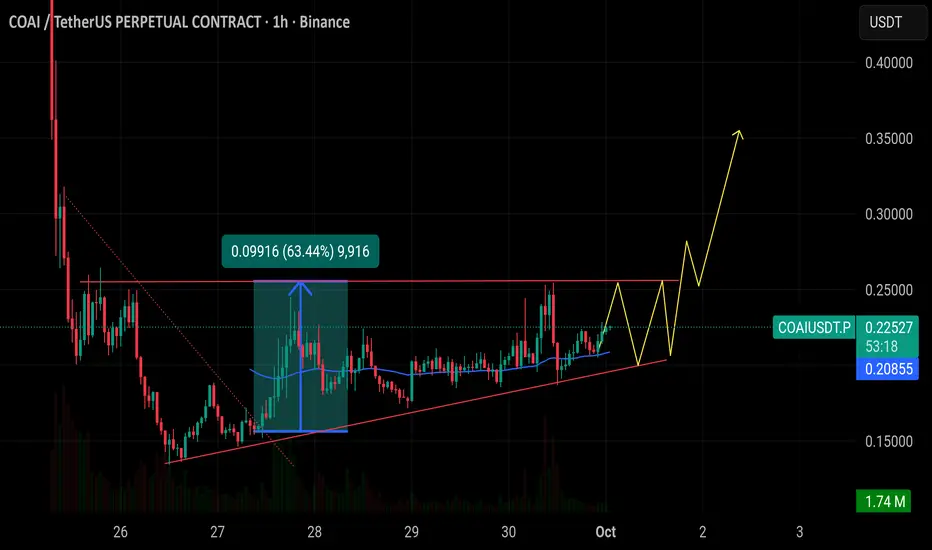$COAI after a 63% pump is now trading in an Ascending Triangle with resistance around 0.25 and rising support near 0.20. A breakout above 0.25 could push the price toward 0.35–0.40, while losing the rising support would risk a sharp drop back under 0.19.