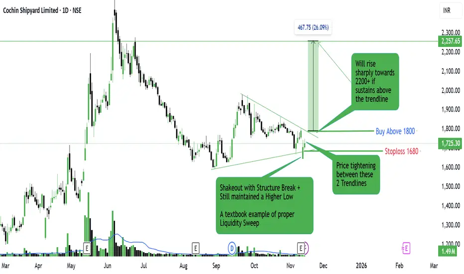 Cochin Shipyard has just completed a **textbook liquidity sweep** and is now showing a clean structural shift. The stock first broke structure with a shakeout under the rising trendline but smartly reclaimed it while maintaining a higher low — a strong signal that sellers have been absorbed.