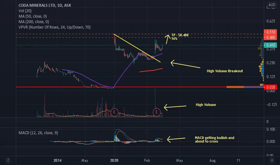 COD is expected to continue higher as it broke out of the Pennant with very High Volume and MACD is also Bullish!! It got support right at the POC of Volume Profile and bounced off giving a bullish closing. I am bullish COD and expect to move higher. My trade plan is given below: