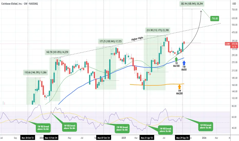 This time we have in our hands perhaps the strongest bullish confirmation signal of this Cycle, the 1W RSI breaking above its MA trend-line. This took place last week and every time Coinbase did this in the past 2 years, it rallied by at least +100%.