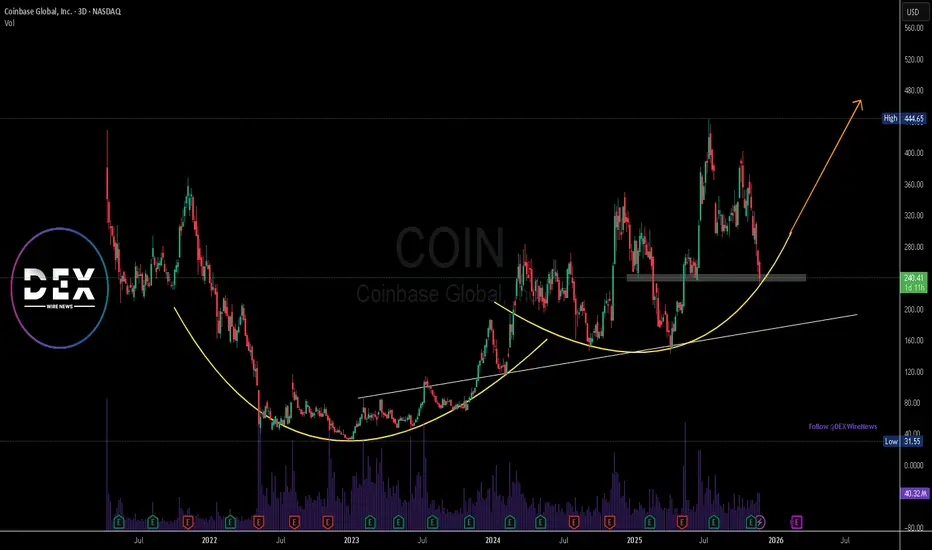 COIN recently retraced sharply from its $444 high, falling toward the $240 support zone, where it currently trades. This level is critical: a breakdown could send price toward the ascending trendline near $170, aligning with the previous higher low.