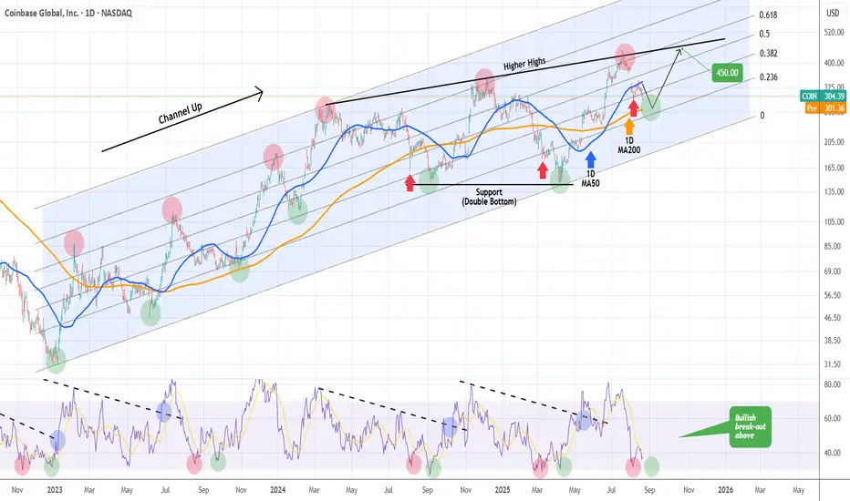 Last time we looked at Coinbase (COIN) was more than 3 months ago (May 07, see chart below) where we gave a strong buy signal on its 1D MA50 (blue trend-line), which instantly delivered a rally that eventually hit our $400 long-term Target: