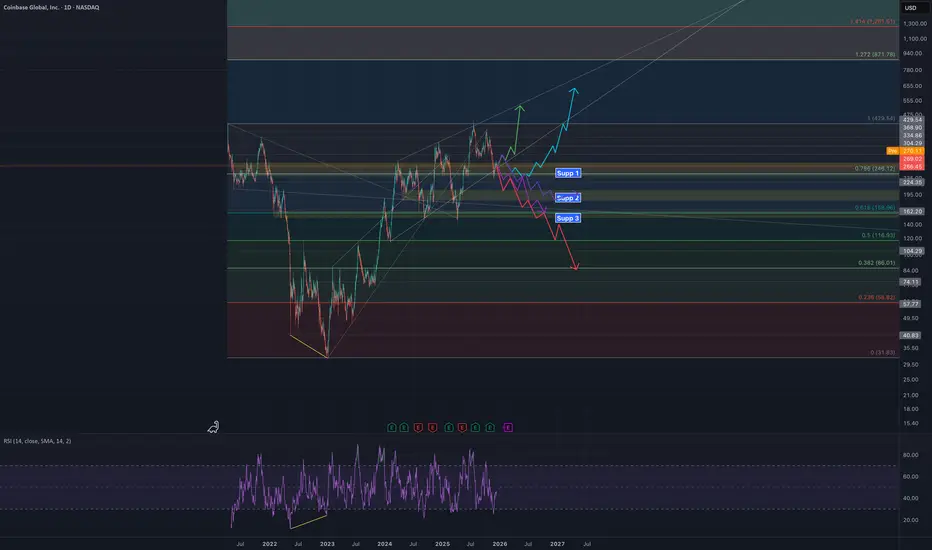 Following the purple arrow, the stock experiences a deeper correction, falling to Support 2 (Supp 2), which is near the $188.96 (0.618 Fib) level. A successful bounce here confirms the long-term bullish trend is intact, as the 0.618 Fibonacci level is a key point for a "healthy correction."