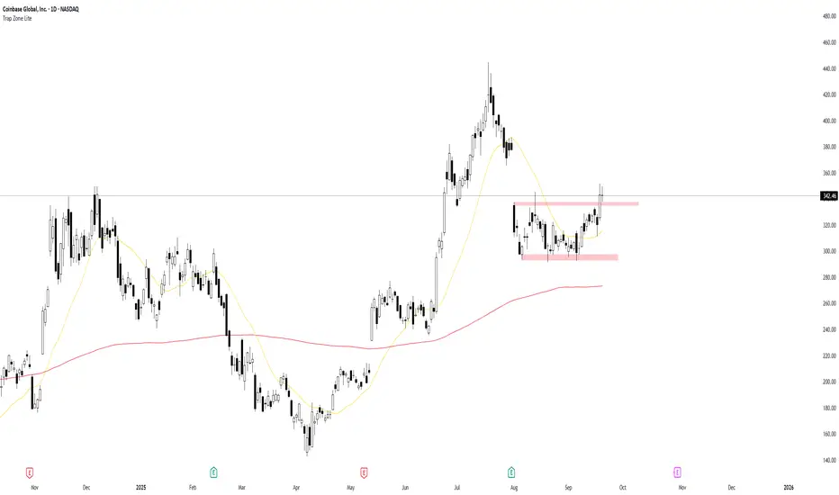 COIN has been consolidating for several weeks and just broke above the range. The 20-MA has turned upward, confirming a renewed bullish bias. Today’s resting bar after the breakout creates an ideal continuation setup for a long entry.