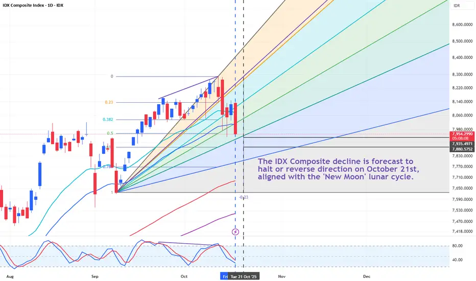 A bearish stochastic divergence has appeared on the Daily chart, signaling that a downward trend is currently taking place, the IDX Composite decline is forecast to halt or reverse direction on October 21st, aligned with the 'New Moon' lunar cycle.