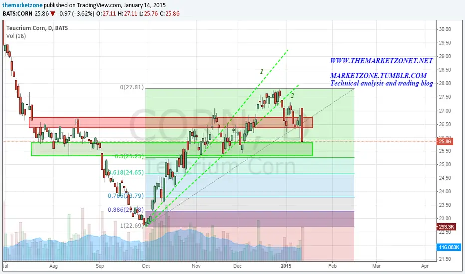 After breaking down two uptrend lines, CORN is back the 25.5$ zone (now support).