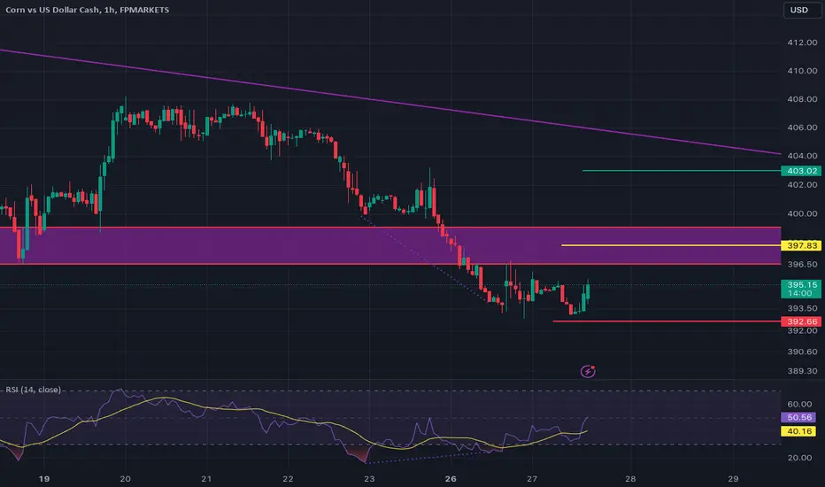 Corn analysis is done on an hourly chart. There is a bullish divergence on an hourly chart with a formation of double bottom reversal pattern. Placed an entry on the previous LH with SL placed just below the double bottom.