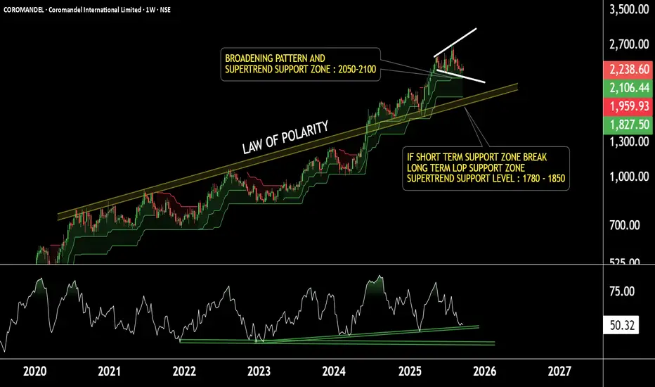 Coromandel is maintaining a Higher High – Higher Low (HH–HL) structure on the weekly timeframe and is currently taking support from the Supertrend indicator, with immediate support near ₹2100. The stock is also forming a broadening pattern with a strong support zone around ₹2050.