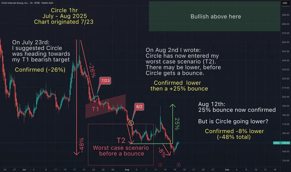 Aug 2nd - The bullish scenanrio was quickly invalidated as Circle broke below my T1 red box & entered my bearish T2. At that point I suggested Circle would go lower before a bounce.