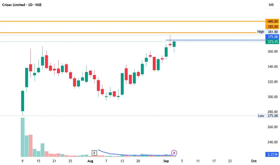 Crizac showed a good volume in the last session. If breaks the previous day high and closes above 375 then it may go upto 385 till 400.