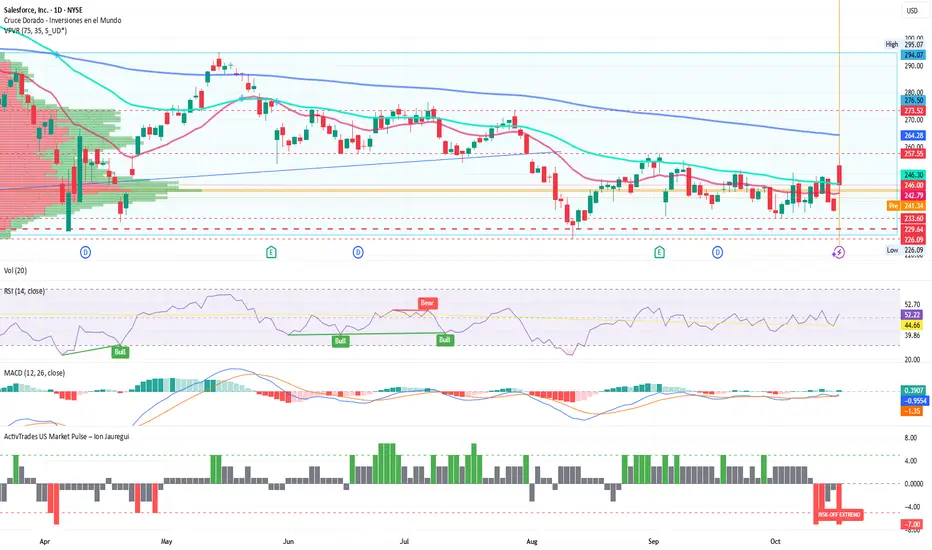 Salesforce shares closed yesterday at $240, following a steady recovery from August lows of $226. On the technical side, the stock maintains a solid sideways trend, with support at $233.60 and a current point of control (POC) near $244. Resistance was tested yesterday at $257.55; if that level is broken in the coming sessions, we could see a move toward the $273.52 zone, last seen in July.
