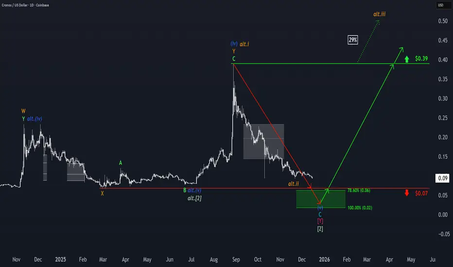 Crypto.com coin Cronos has continued its move toward the green Target Zone between $0.06 and $0.02. We expect the low of the large wave [2] correction to form within this range. A sustained upward move should only become the main focus once this significant bottom is in place. There is a 29% probability that the low of the green wave alt.[2] has already been reached. If that’s the case, the next step could be a breakout above the resistance at $0.39, rather than a drop below the $0.07 support.