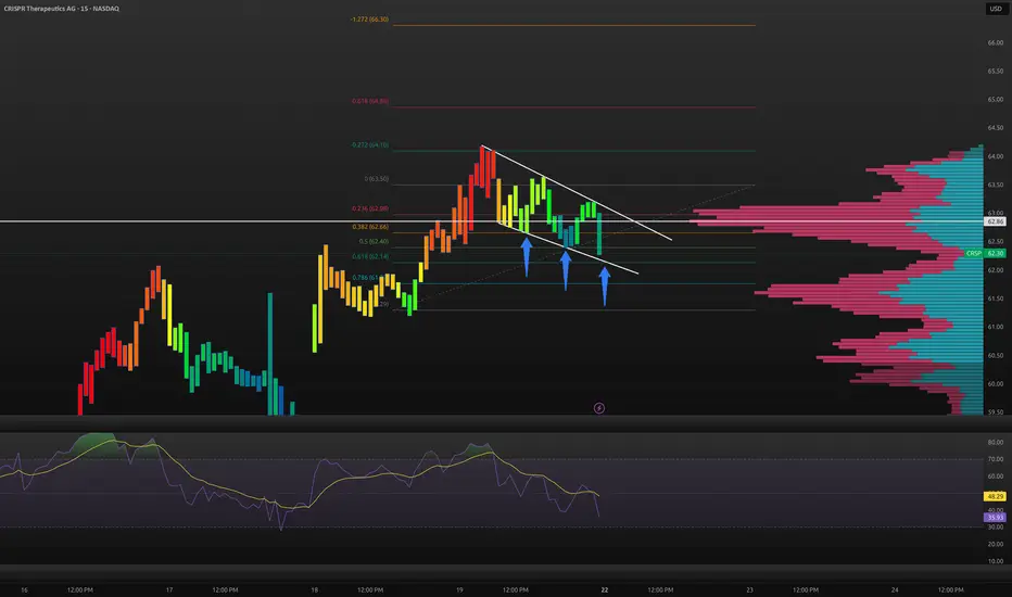 If you're looking for an entry on CRISPR, we're at a great spot. You can see the fib is respected at the .382 .50 and soon, again, at the 61.8. You can also see we have a low volume node right at that level. 3 points of confluence will give you a great entry to try for the extension to new highs.