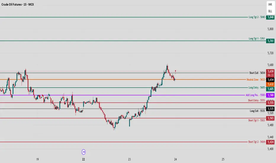 Crude Oil is consolidating near 5,658 after a sharp upside move, reacting to mapped levels designed for intraday momentum traders.