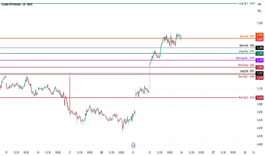 Crude Oil remains active in a tight trading band, currently oscillating near 5,433 with price action revolving just below the key zero line at 5,437. The recent upward spike has given way to a phase of measured consolidation, with traders watching closely for a decisive breakout or breakdown.
