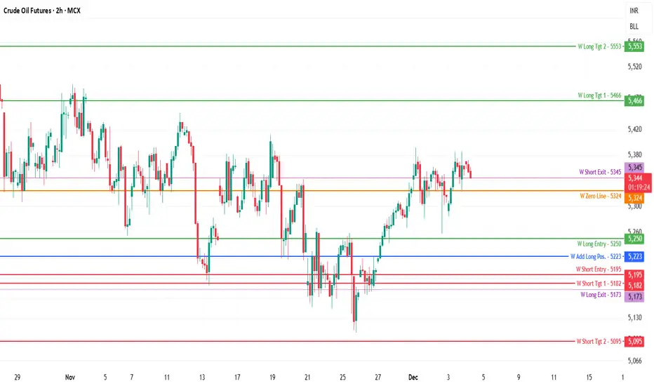 Upside reference targets stand at 5,466 (W Long Target 1) and 5,553 (W Long Target 2), marking positional booking areas if crude sustains above the Zero Line and builds higher highs.