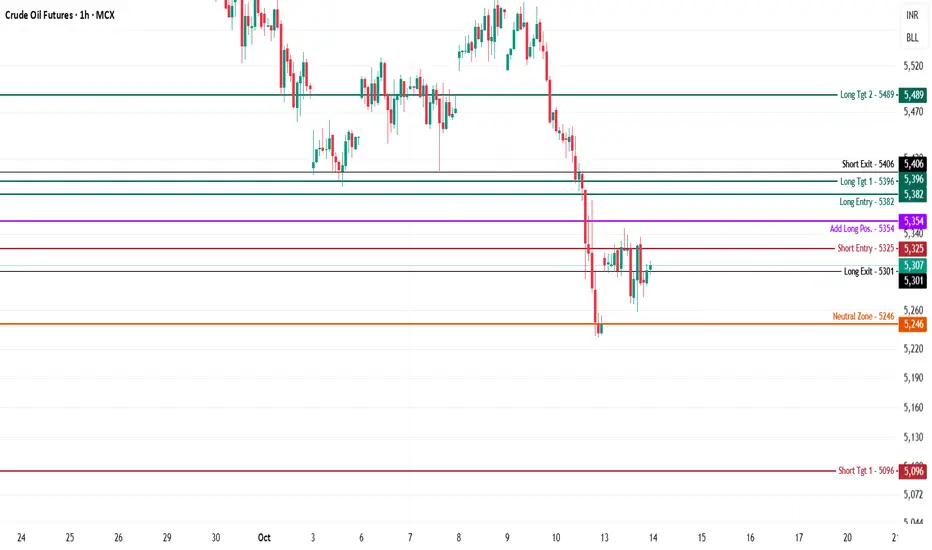 Crude Oil is trading at 5,307, consolidating after a steep fall and holding just above the neutral zone (5,246). Price is compressing between intraday supply and demand.