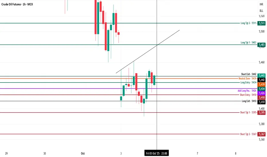 Crude Oil is trading at 5,443 in a tight consolidation zone, oscillating between short-term support and resistance, with a neutral-to-slightly-bullish bias near the session high.