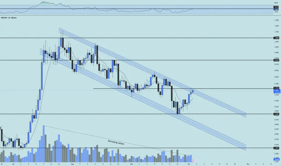 👀 On the daily timeframe for CRV, we can see that after a strong rally, the coin entered a corrective descending channel. Now there are signs of a potential breakout from this channel on this timeframe. If the channel’s upper boundary is broken — which overlaps with the key resistance at 0.7634 — we can say a new bullish trend is starting for this coin. That would mean it’s leaving this compression and correction phase and forming a new upward structure. On the USDT pair, CRV has already managed to build a higher low, and on the BTC pair, it is also gaining momentum for a move. This coin can be added to your watchlist for trading opportunities.