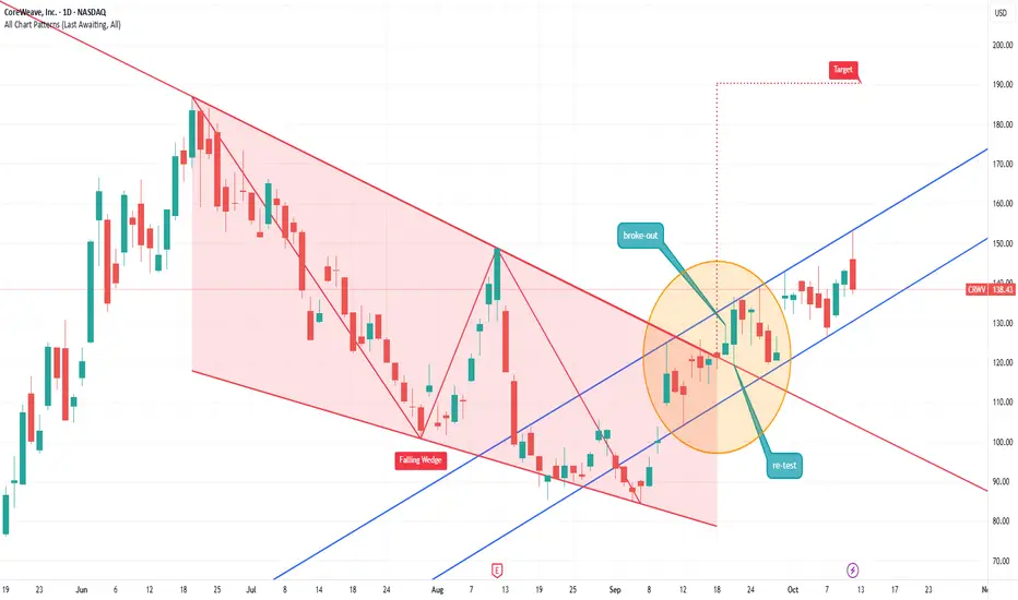 CRWV recently broke out from a falling wedge with a re-test. The broke out target would be at around $190. So far it's riding toward that in the new uptrend channel.