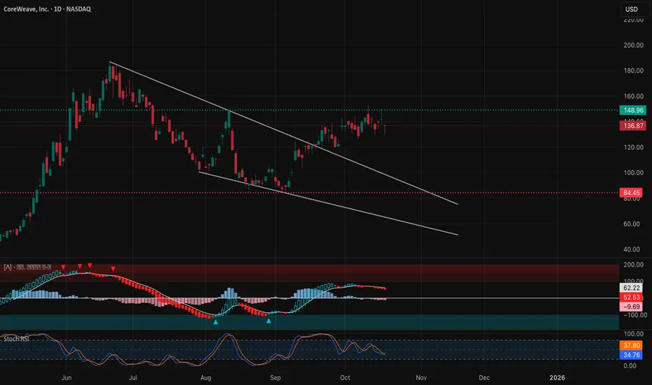 CoreWeave’s daily structure shows a clear descending channel since June, with a recent breakout attempt that stalled near $148–$150. After that local top, price retraced back into the mid-range near $136–$138, where buyers are trying to defend short-term structure.