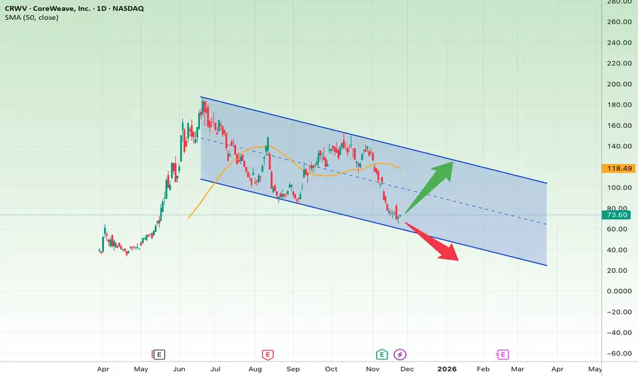 The chart shows CRWV moving inside a downward trending channel, and the price is now touching the bottom of the channel, where it has shown a mild bullish reaction. This zone can offer a good risk-to-reward long opportunity, but only if the lower boundary holds.