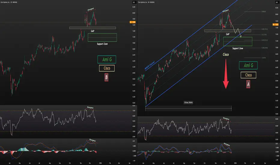 As shown on the chart, Cisco is trading near the upper boundary of its 9-month channel. After forming two strong divergences on the 4H chart (Chart A) and the daily chart (Chart B)—confirmed by both MACD and RSI—the stock has entered a corrective phase.