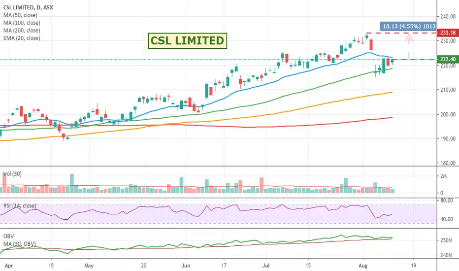 CSL is a little bit stuck at the moment ranging sideways in a +- 5% channel. Could be at a good value area for anyone looking for an entry or to top up. Volume is a bit weak so perhaps look for confirmation of an upward move before committing.