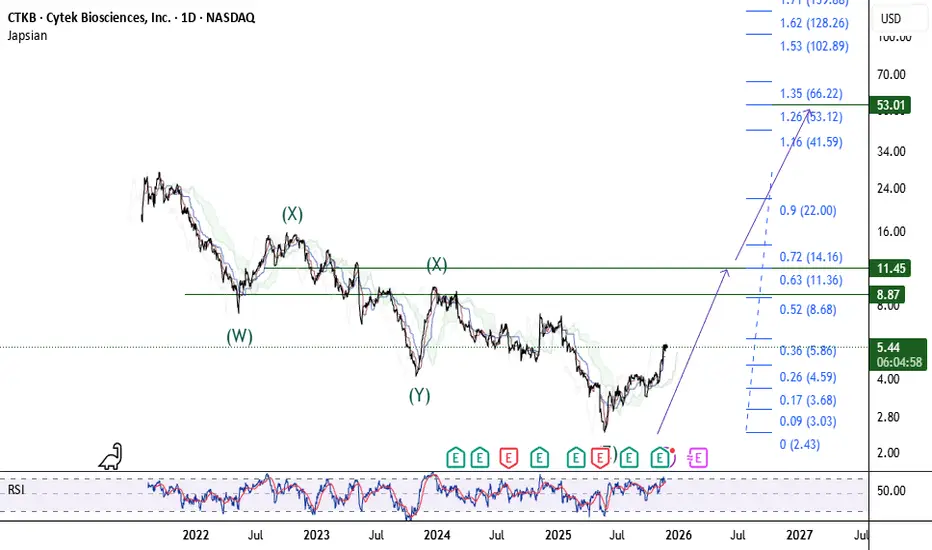 After completing what appears to be a complex corrective structure, this stock seems likely to make a retracement toward at least the 0.63 level (around $11.5) of the entire bearish wave. If it breaks above this zone, the long-term Fibonacci target at 1.26 (around $54) will be activated, which I’ve marked on the chart.