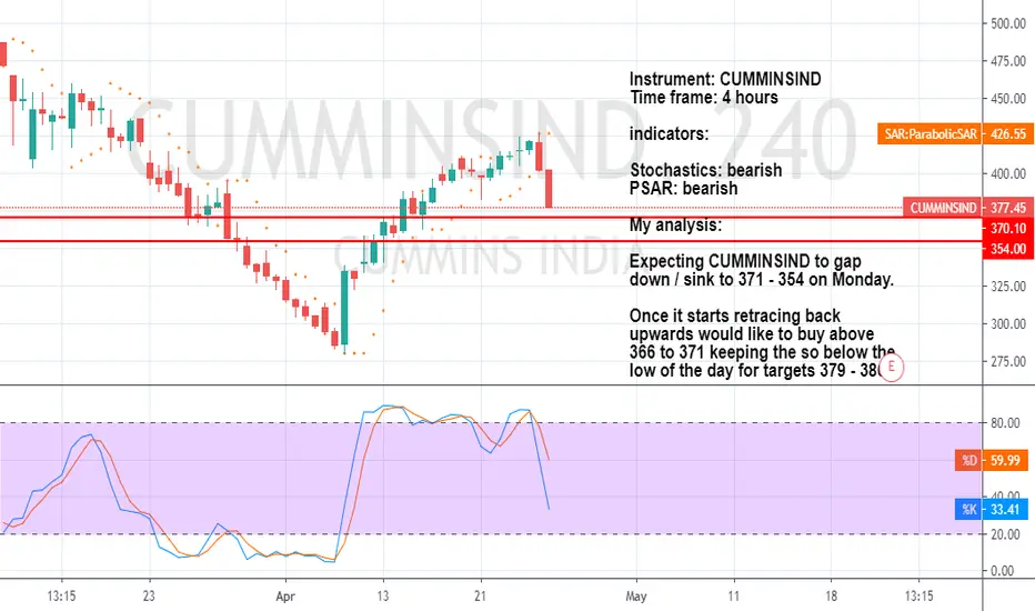 Expecting CUMMINSIND to gap down / sink to 371 - 354 on Monday.