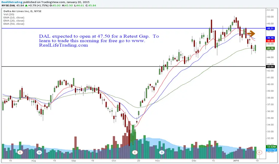 DAL expected to open at 47.50 for a Retest Gap. To learn to trade this morning for free go to RealLifeTrading.com