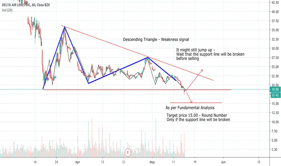 The prices are moving sideways with a weakness signal (Descending Triangle) - Based on probabilities and on Fundamental Analysis (Virus still with us) the idea is to go short.