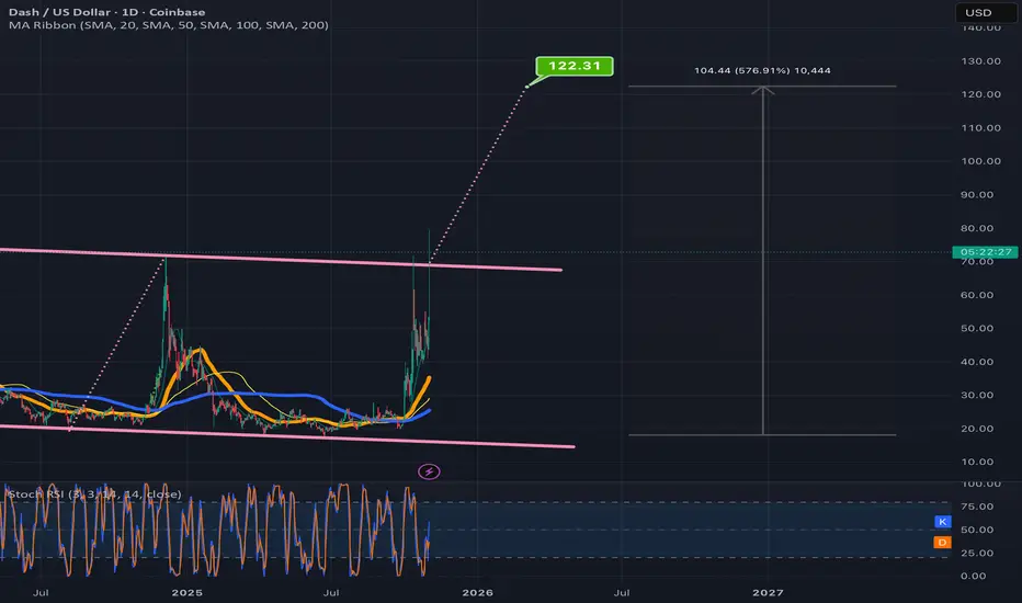 Until recently, Zcash and Dash tended to pump and dump in tandem with eachother, ever since ZCash’s recent big breakout though Dash has noticeably lagged behind. It was hard to say whether it was just delayed reaction on dash’s part or if a true decoupling between the two ahd occurred but it seemed like a least a safe gamble(not financiala dvice) to put a little chunk of money on dash in the interim in case it would do something similar to what Zec has been doing in the enar future. So that’s what I did and now dash is pumping and has gotten above the top trendline of this pink channel. If it validates the breakout at this breach point the measured move target is around $122. From the bottom around $18 thats over a 500% gain. Could always just keep going after that like Zcash has done also but that remains to be seen. First things first is just to validate the breakout of the channel which has not yet happened but a decent probability that it will. *not financial advice*