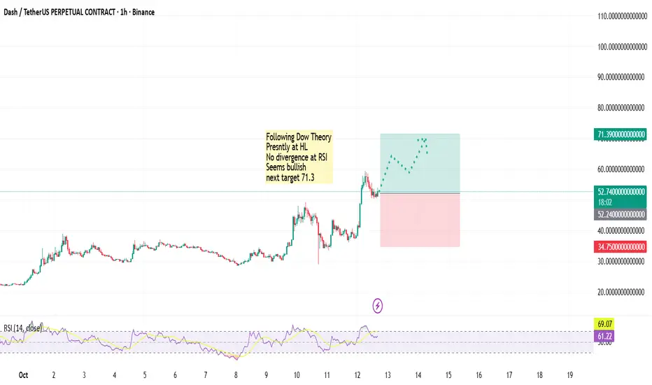 DASHUSDT is currently maintaining structure in line with Dow Theory, forming a Higher Low (HL), indicating that buyers are still in control of the broader move. RSI shows no bearish divergence, supporting the continuation of bullish momentum rather than signaling exhaustion. With price holding above recent support and structure remaining intact, sentiment leans bullish. As long as current HL is respected, the next upside objective stands around 71.3, where the next resistance zone is likely to be tested.