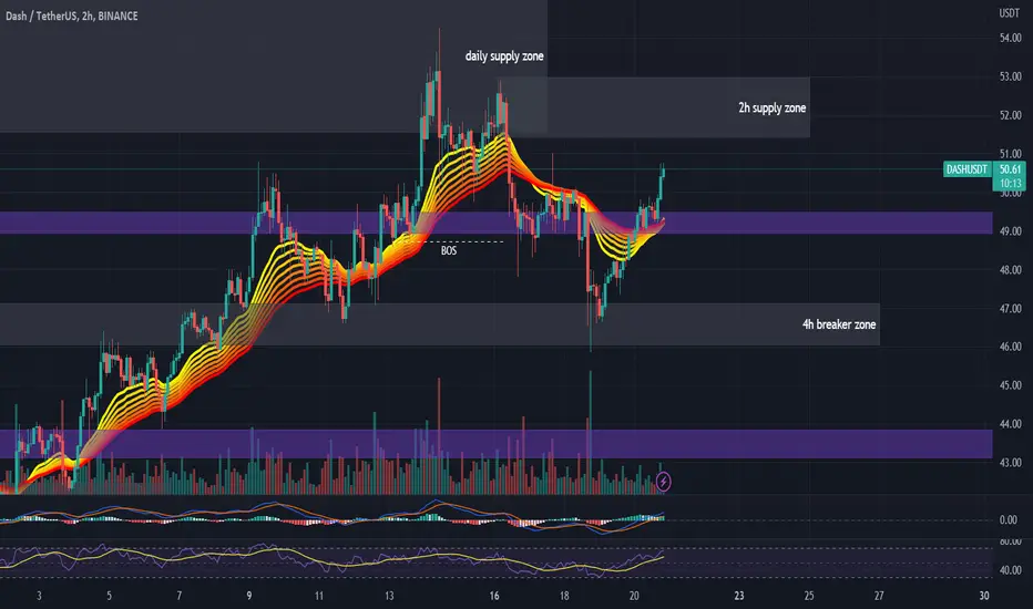 Price is currently moving up after breaking above the resistance at $49.3. MACD is bullish, RSI is bought and EMAs are neutral. I expect price to move up and reach the 2h supply zone where i am looking to short from aiming towards the support around $43.5.