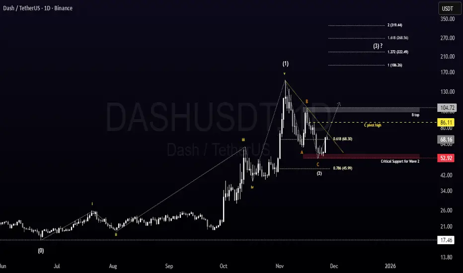 Wave 2 seems to have completed after a clear A-B-C correction, and price held strongly above the C-low support.