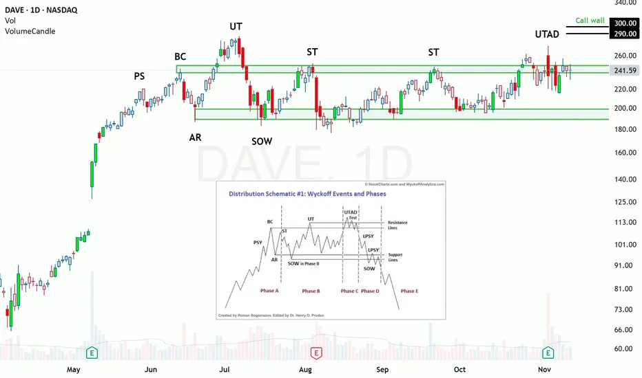 DAVE is flashing elements of a Wyckoff Distribution and could be setting up for a pullback soon. The market moves in cycles: buy low, uptrend, sell high, downtrend, repeat. The sell high part is what we are interested in for today's chart. Wyckoff theorized that you could identify when participants are finally starting to sell their shares by analyzing price and volume. The process is roughly outlined via his trading schematics.