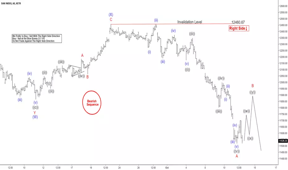 DAX short-term Elliott wave view suggests that the decline to 11865.47 low ended blue wave (W). Up from there, the bounce to 12460.67 high ended blue wave (X). The internals of that bounce unfolded as a zigzag structure where red wave A ended at 12184.41 high in lesser degree 5 waves. A pullback to 12064.41 low ended red wave B in 3 swings. While a rally to 12460.67 ended red wave C in another 5 waves in lesser degree cycle & also completed blue wave (X) bounce.