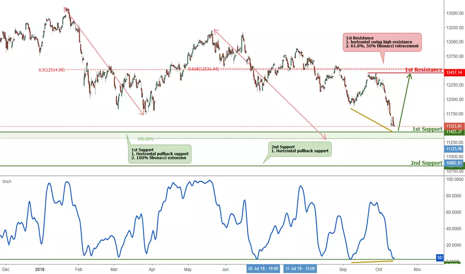 DAX is approaching our first support at 11425 (horizontal pullback support, 100% Fibonacci extension) where a strong bounce might occur above this level pushing price up to our first resistance at 12547 (horizontal swing high resistance, 50%, 61.8% Fibonacci retracement). Stochastic (89,5,3) is also approaching support and seeing a bullish divergence and we might see a corresponding bounce in price should it bounce off this level.