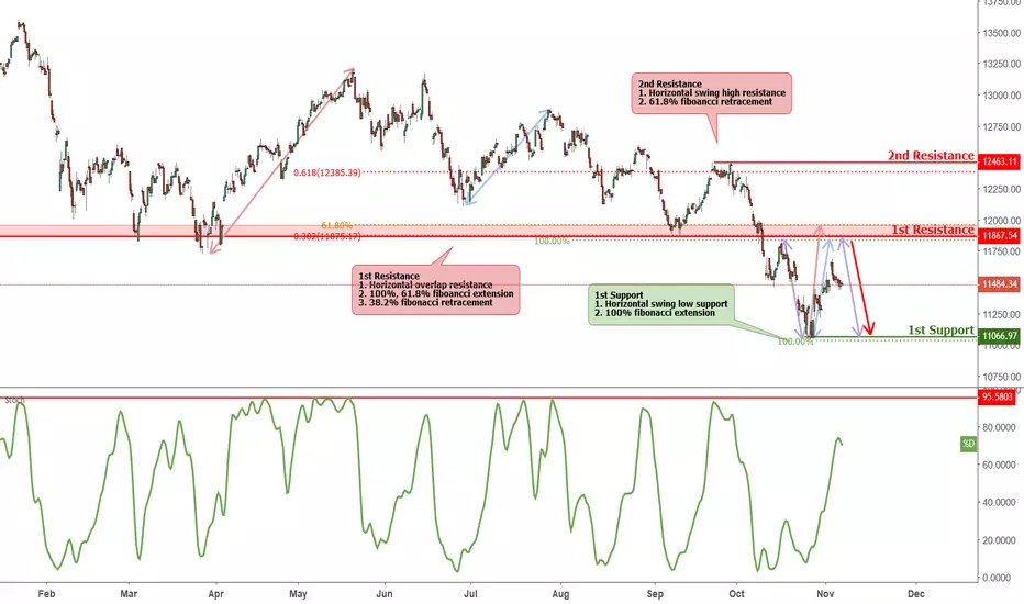 DAX is approaching our first resistance at 11867.54 (horizontal overlap resistance, 100%, 61.8% Fibonacci extension , 38.2% Fibonacci retracement ) where a strong drop might occur below this level pushing price down to our first support (horizontal swing low support, 100% Fibonacci extension ).