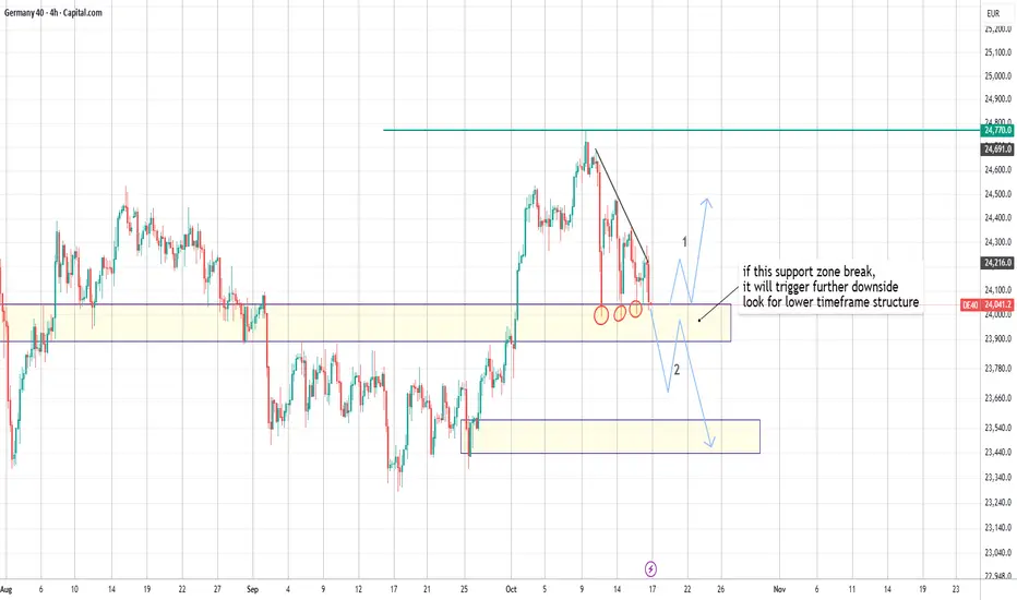 DAX 40 drop from ATH 24770 to recent lowest 24000 and keep above the this support zone for a week. DAX40 is now in a short term downtrend and if it breaks 24000 level. it will break further downside to 23500 level.