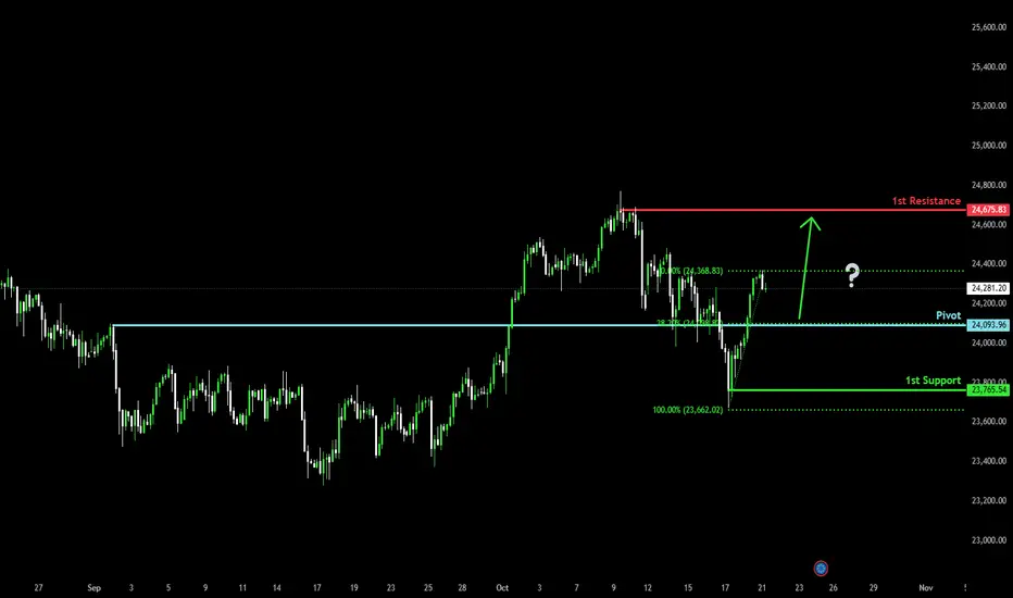 DAX40 (DE40) is falling towards the pivot which is an overlap support that aligns with the 38.2% Fibonacci retracement and could bounce to the swing high resistance.