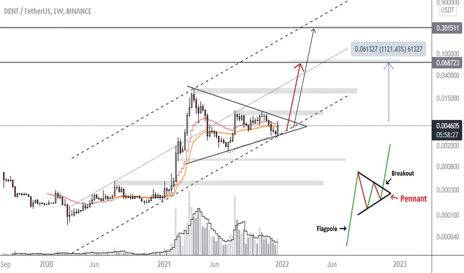 Dent is forming a clear pennant and looks decent on the weekly time frame. It needs to break out of the pennant to hit $0.068 as the first target. The next target at $0.3 requires a super bullish market but it's not impossible to reach.